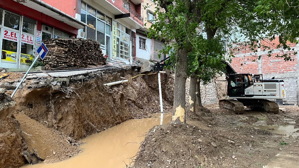 Sokağın tamamen çökmesini engellemek için bölgeye iş makinesi sevk edildi. İş makinesiyle yol desteklendi.