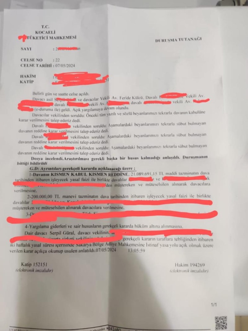 Kocaeli 1’inci Tüketici Mahkemesi'nde açılan dava 8 yılın ardından karara bağladı. Mahkeme, aileye 21 milyon 89 bin 691 TL maddi, 200 bin TL de manevi tazminat ödenmesine hükmetti.