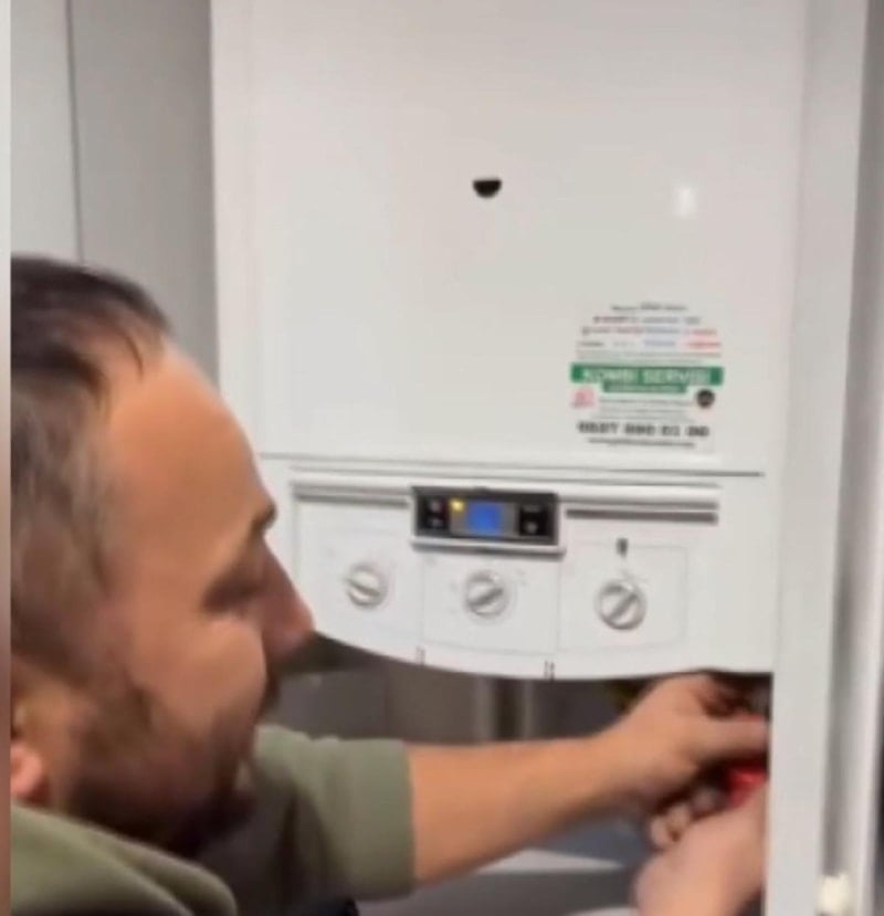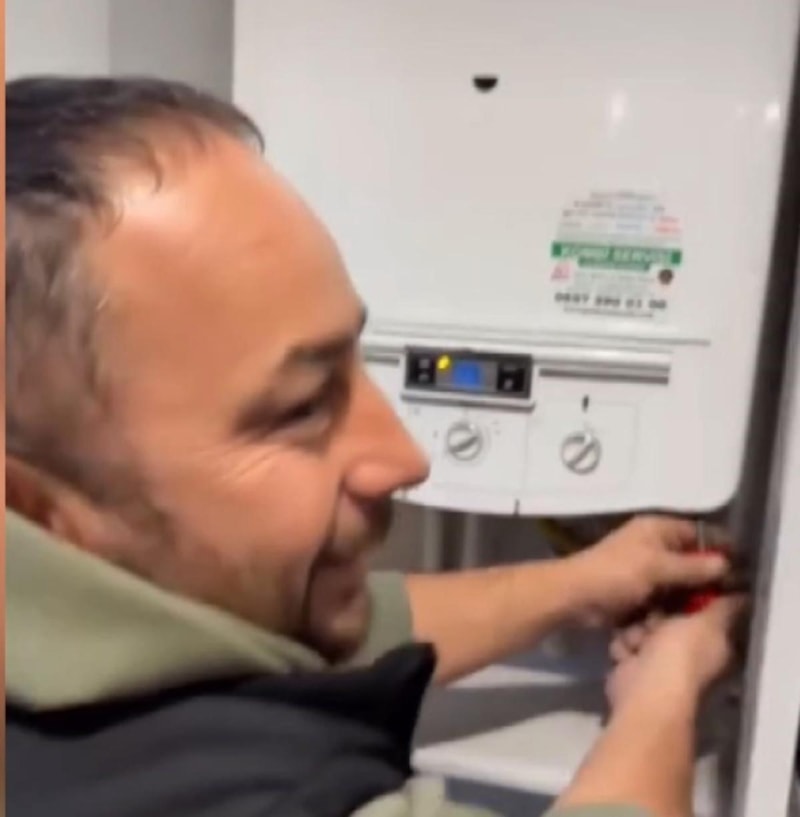Videoda, Levent Bilir'in bir kombiye müdahale ettiği ve bu sırada gülümsediği görülüyor.