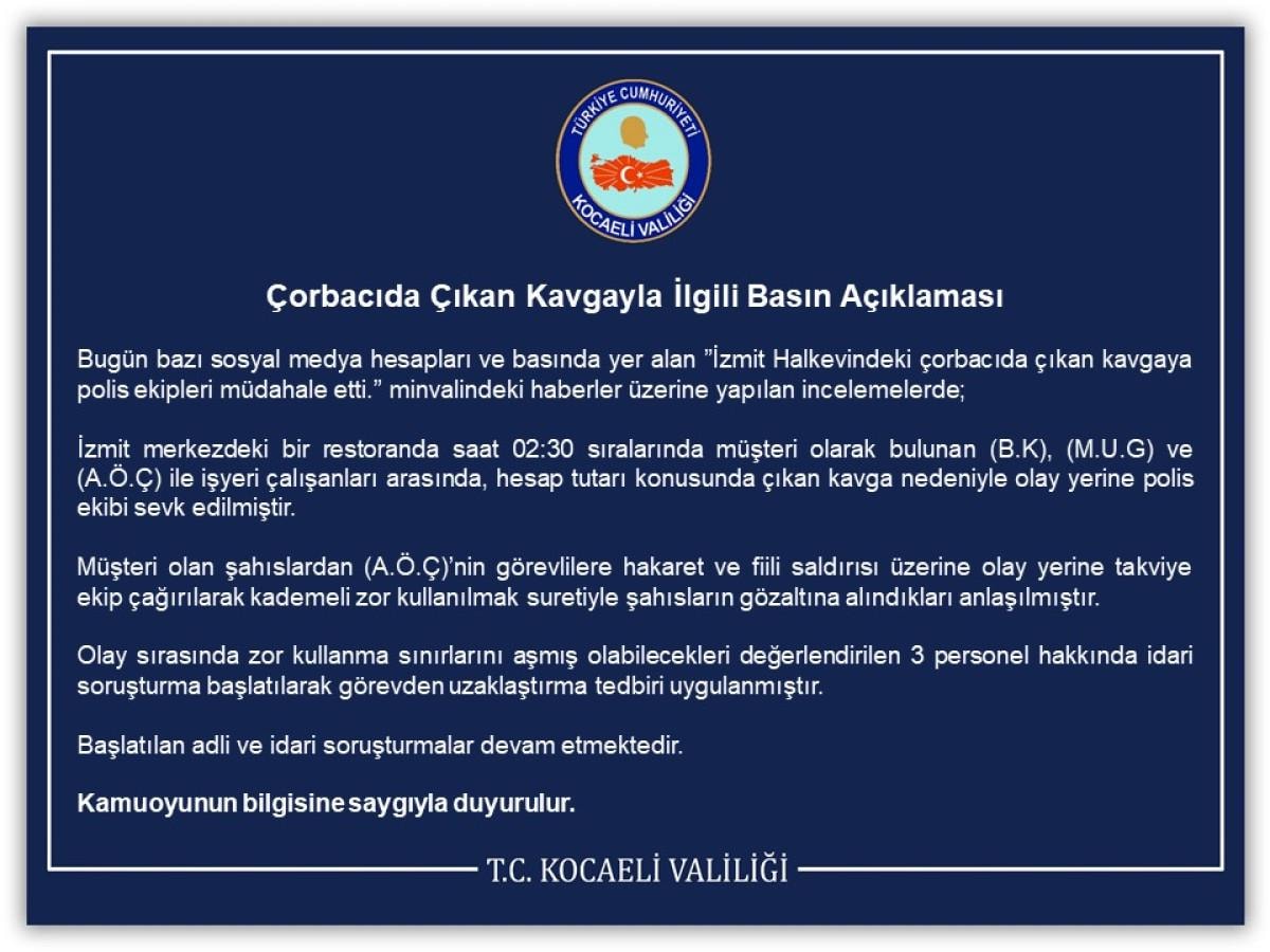 "İzmit merkezdeki bir restoranda saat 02.30 sıralarında müşteri olarak bulunan B.K., M.U.G. ve A.Ö.Ç. ile iş yeri çalışanları arasında, hesap tutarı konusunda çıkan kavga nedeniyle olay yerine polis ekibi sevk edilmiştir. Müşteri olan şahıslardan A.Ö.Ç.'nin görevlilere hakaret ve fiili saldırısı üzerine olay yerine takviye ekip çağrılarak kademeli zor kullanılmak suretiyle şahısların gözaltına alındıkları anlaşılmıştır. Olay sırasında zor kullanma sınırlarını aşmış olabilecekleri değerlendirilen 3 personel hakkında idari soruşturma başlatılarak görevden uzaklaştırma tedbiri uygulanmıştır."