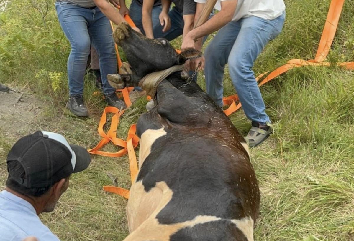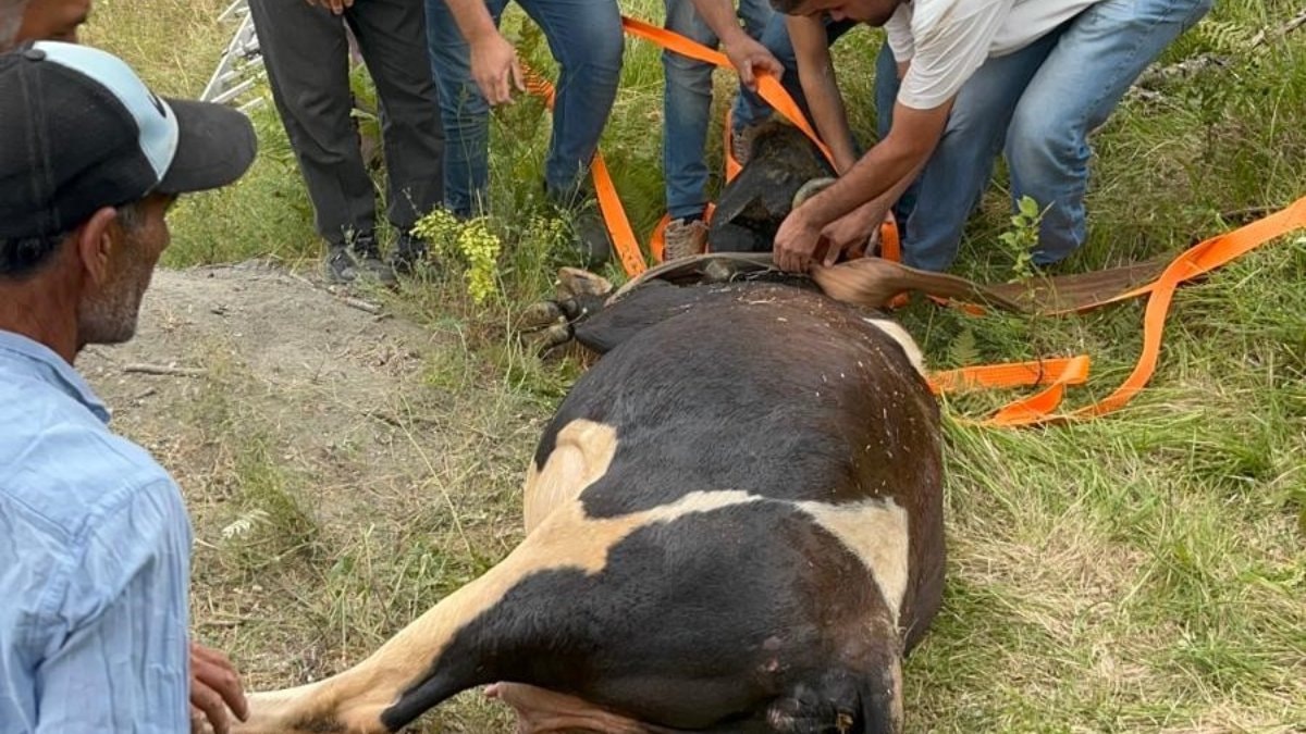 Halatlarla bağlanan inek, yaklaşık 3 saat süren titiz bir operasyonun ardından yara almadan kurtarıldı.