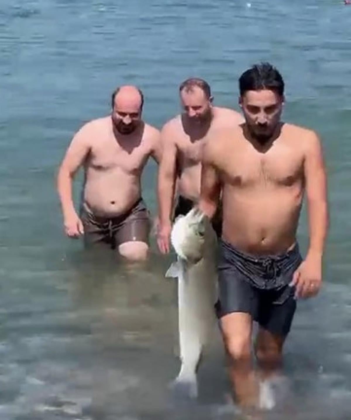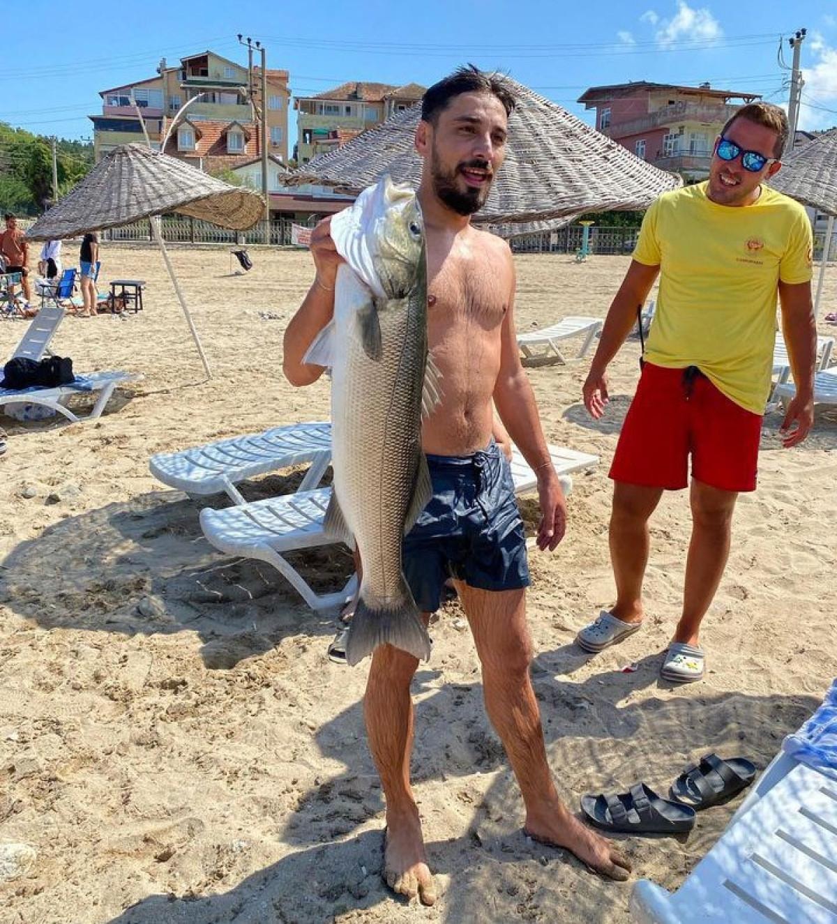 Elinde tuttuğu balıkla sahile çıkan Çağatay Hacıoğulları, kendisini merakla izleyen kalabalığa poz verdi.