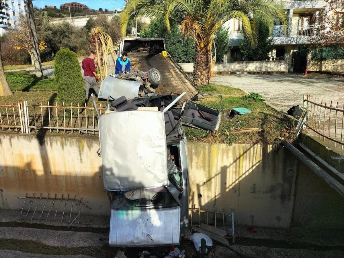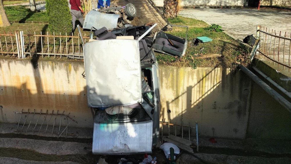 Dereye uçan otomobilde ağır hasar meydana geldi.