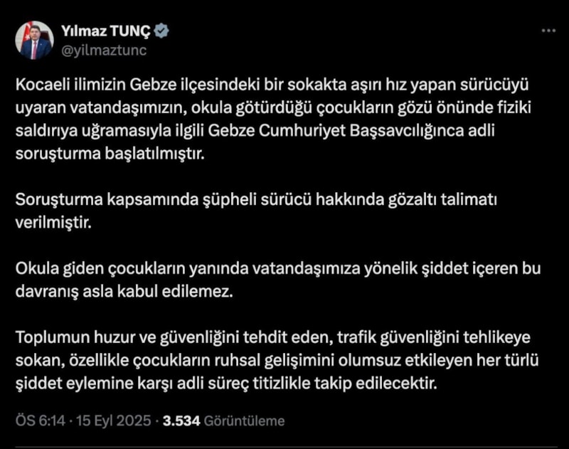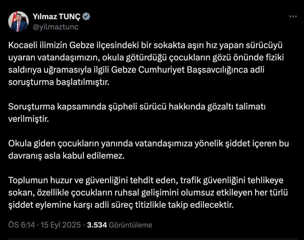 Kocaeli ilimizin Gebze ilçesindeki bir sokakta aşırı hız yapan sürücüyü uyaran vatandaşımızın, okula götürdüğü çocukların gözü önünde fiziki saldırıya uğramasıyla ilgili Gebze Cumhuriyet Başsavcılığınca adli soruşturma başlatılmıştır.