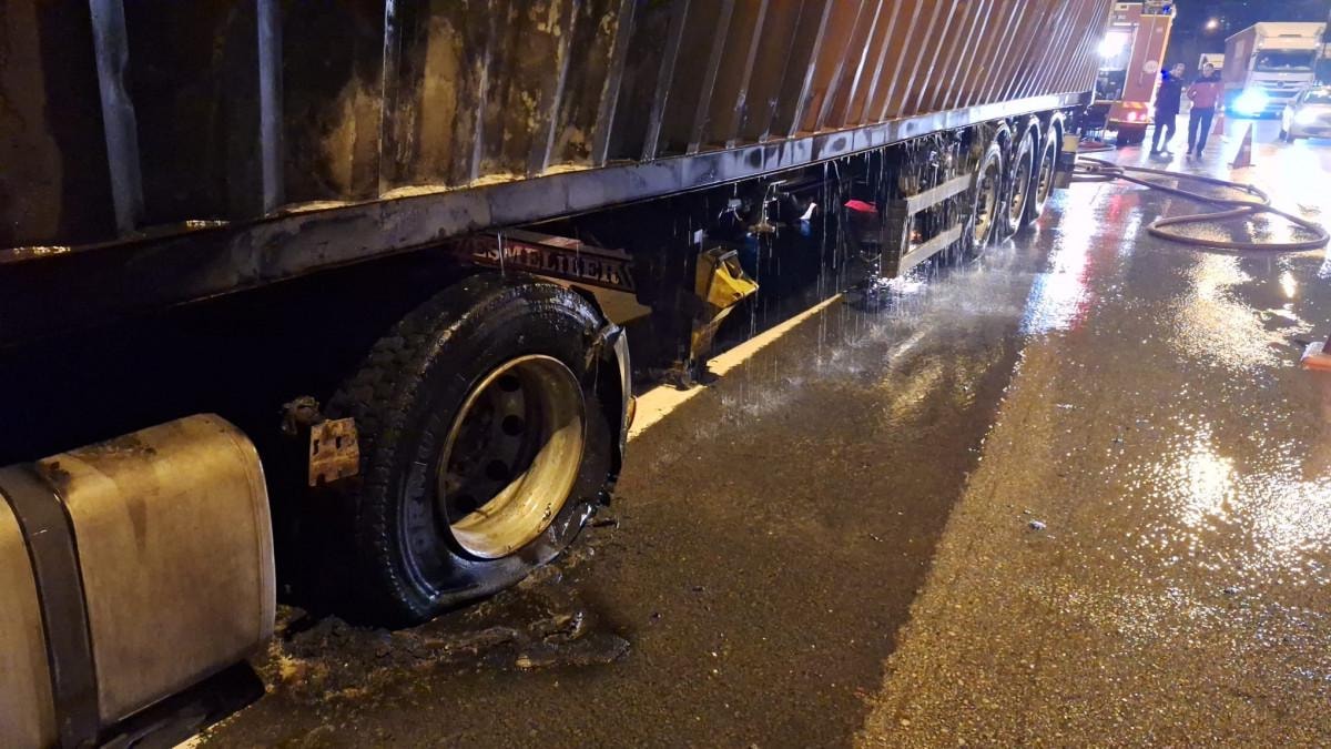 Kocaeli'nin İzmit ilçesi TEM Otoyolu geçişinde M.A. idaresindeki tırın çekici kısmının sol arka tekerleğinin fren sisteminde yangın çıktı.