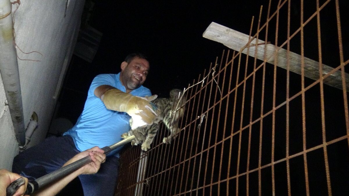Canı yanan kedinin çıkardığı sesleri fark eden bina sakinleri, itfaiye ekiplerinden yardım istedi.