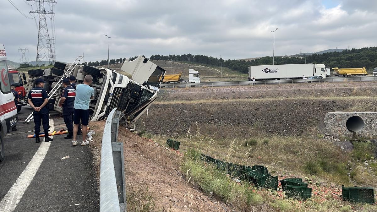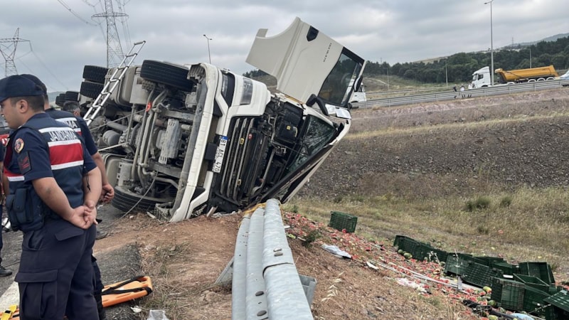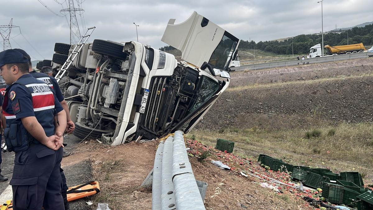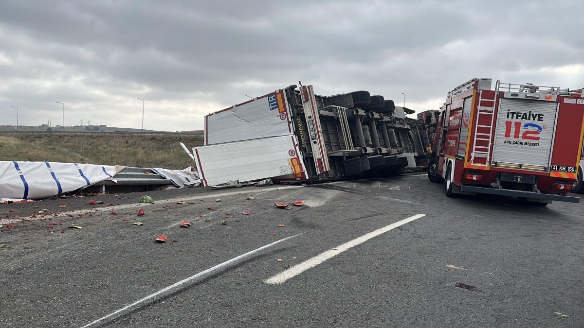 Kocaeli'nin Gebze ilçesi Balçık Kavşağı Kuzey Marmara Otoyolu bağlantısında Hakan S. yönetimindeki karpuz yüklü tır, şoförünün virajda direksiyon kontrolünü yitirmesi sonucu yol kenarındaki bariyerin üzerine devrildi.