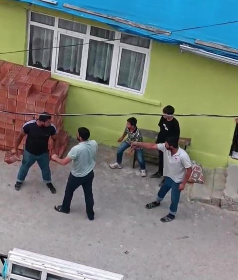 2 kişi ellerine geçirdikleri tuğlalarla birbirine saldırırken diğer 2 kişi yumruklarla kavga etti.