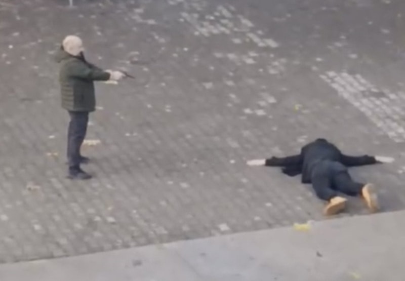 U.C.A. dizlerinin üzerine çöktü, ardından yüzüstü yere yattı.