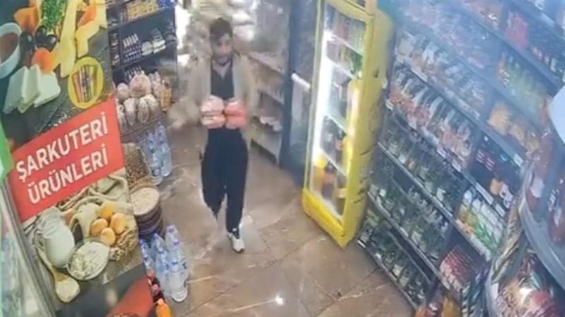 Bu sırada alışveriş yapan müşteri, yıkılan rafların altında kalmaktan saniyelerle kurtuldu.