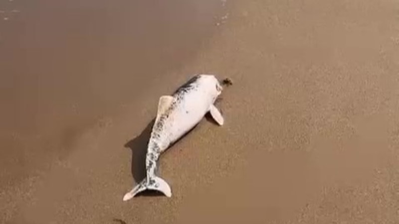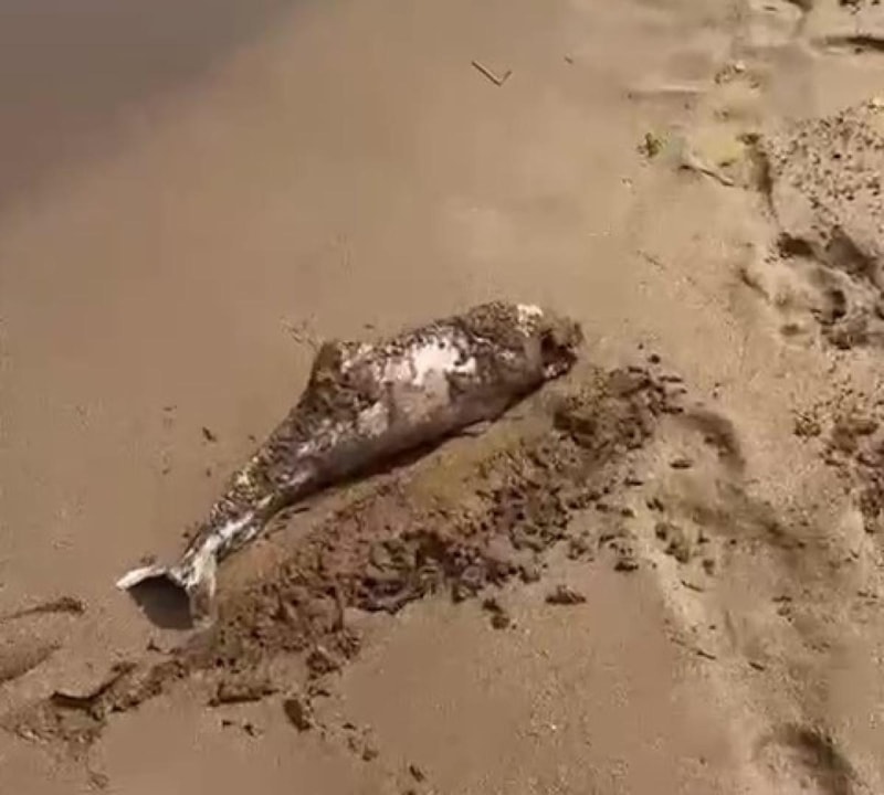 Kandıra ilçesinde bulunan Sarısu Plajı'nda karaya vurmuş ölü yunus yavrusu cep telefonu kamerasıyla görüntülendi.