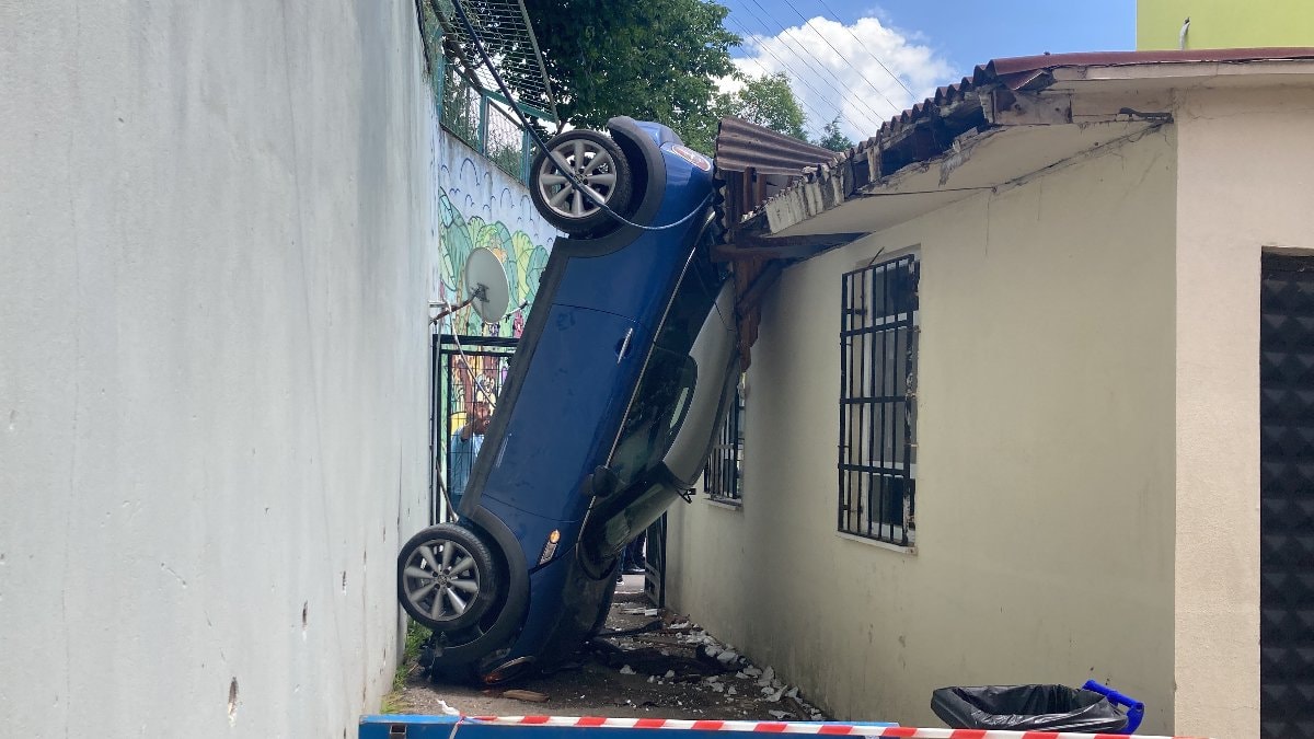 Otomobil, okul kantini ile istinat duvarı arasında dik şekilde kaldı, sürücü ise yaralandı.