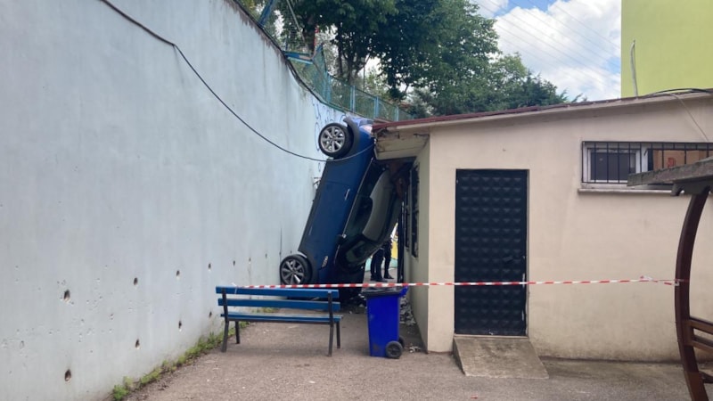 Darıca ilçesinde kontrolden çıkan otomobil, 5 metrelik istinat duvarını aşarak okul bahçesine uçtu. Otomobil, kantin ve istinat duvarı arasında dik kalırken sürücü yaralandı. Öğrencilerin derste olması, faciayı önledi.