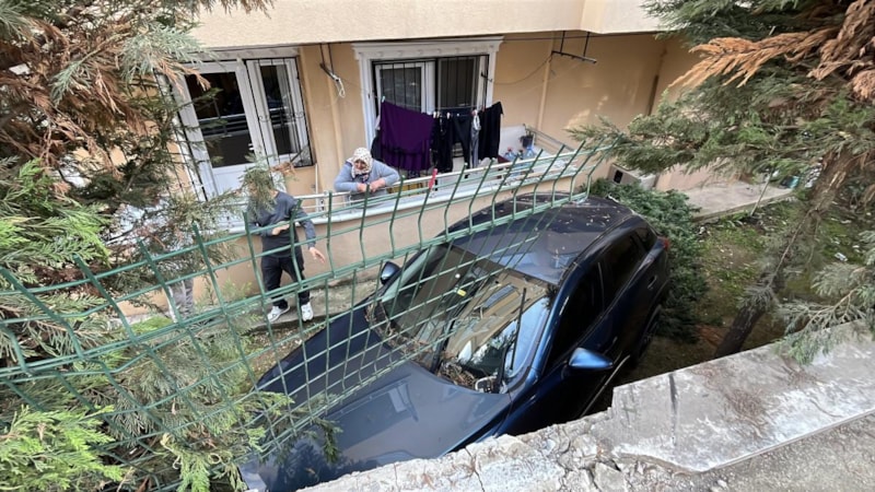 Gebze ilçesinde meydana gelen kazada, bir otomobil 3 metre yüksekliğindeki duvarı aşarak binanın bahçesine düştü.
