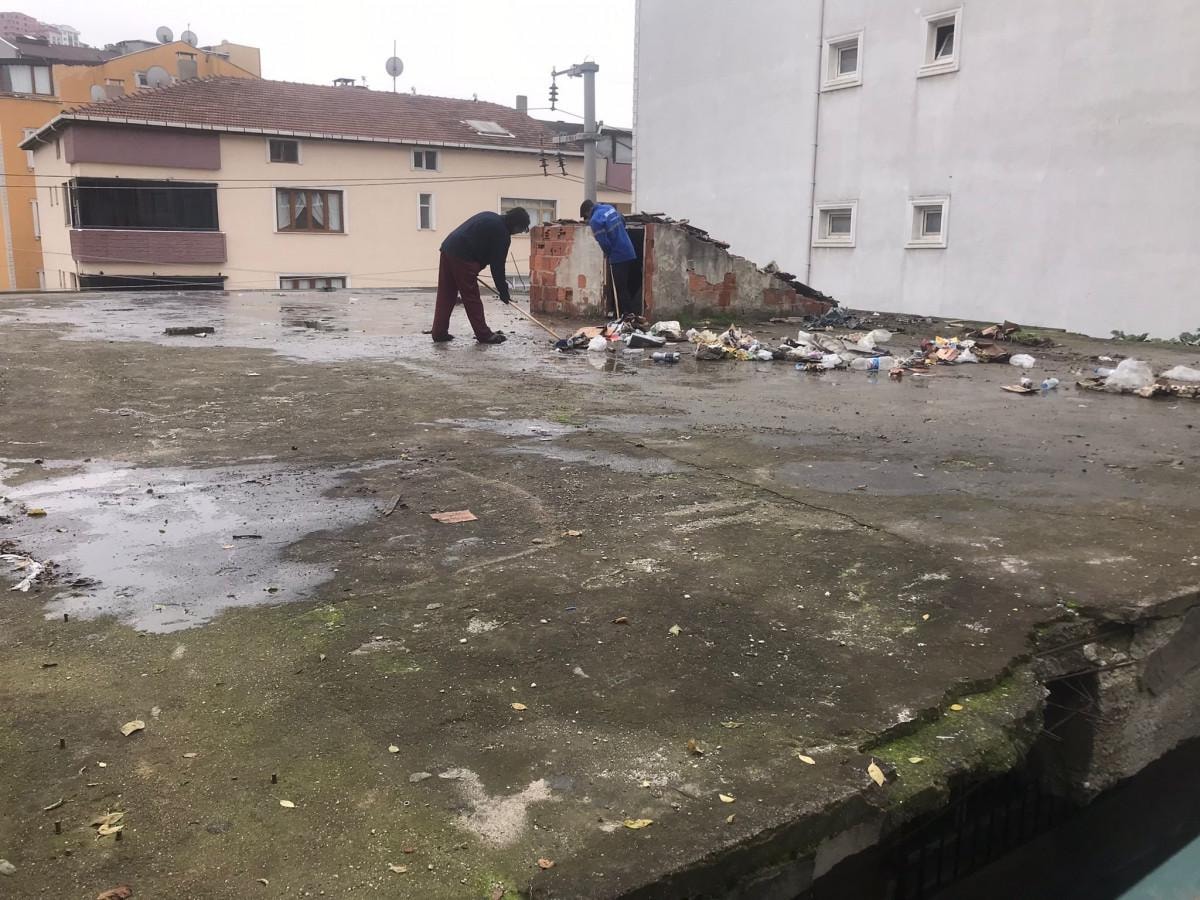 Adrese gelen İlçe Belediyesi Temizlik İşleri Müdürlüğü ekibi, binanın çatısında çöp yığınlarıyla karşılaştı.