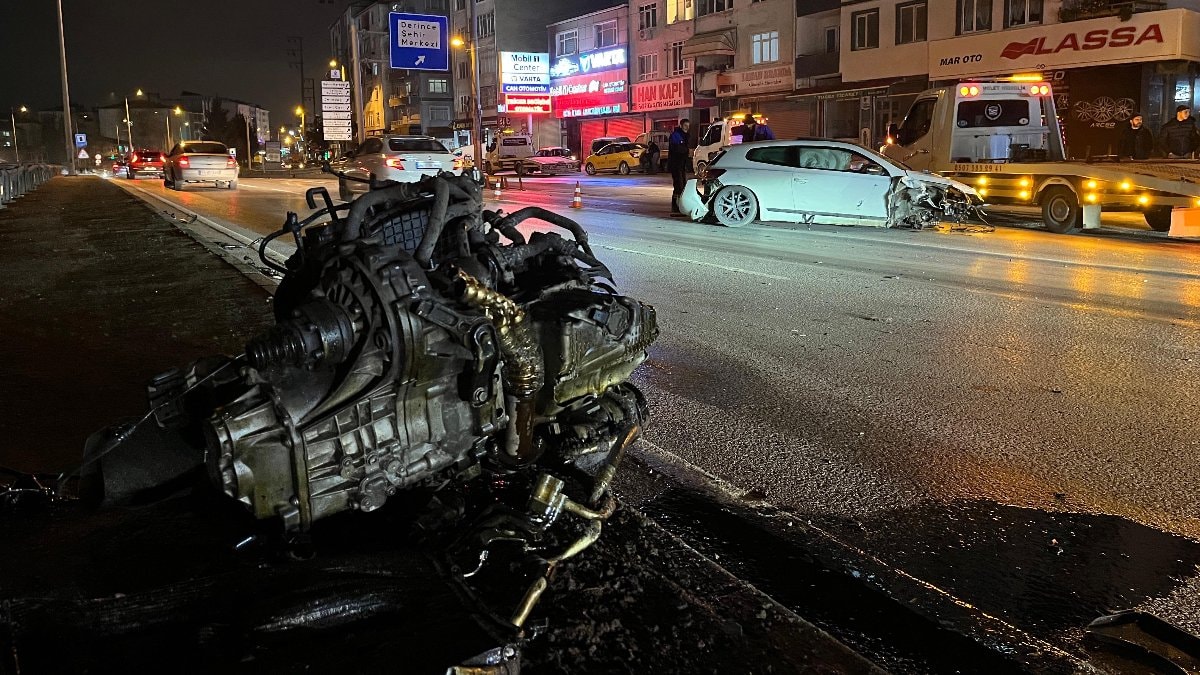 Çarpışmanın şiddetiyle M.T.'nin otomobilinin kopan motoru refüje savruldu.