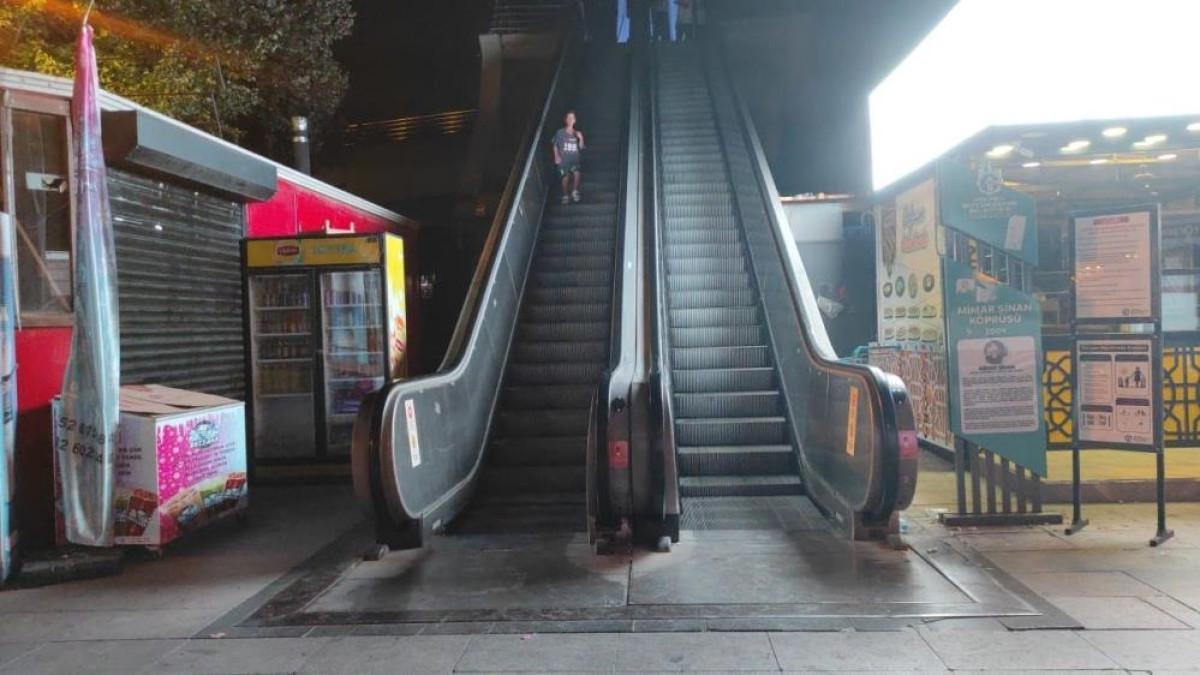 YÜRÜYEN MERDİVENİN KORKULUKLARINA YASLANDI