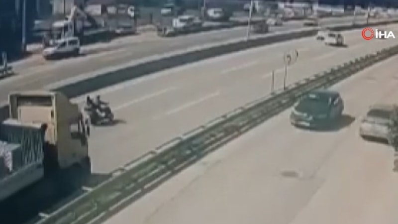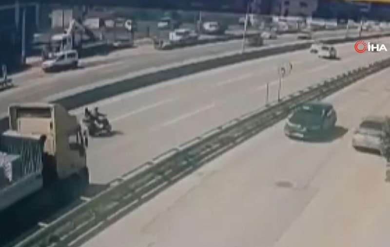 Görüntülerde orta şeritten ilerleyen motosikletin sağ şeride devrilerek seyir halindeki tırın altına girdiği görüldü.