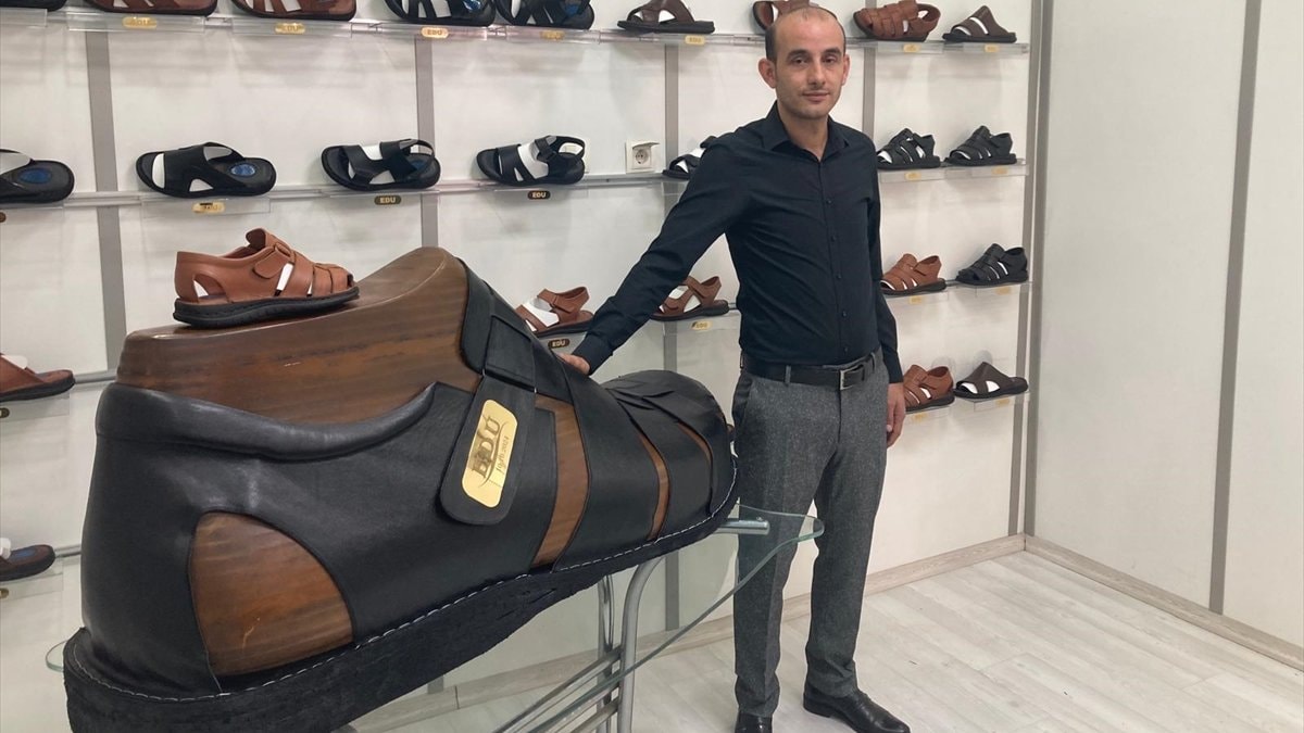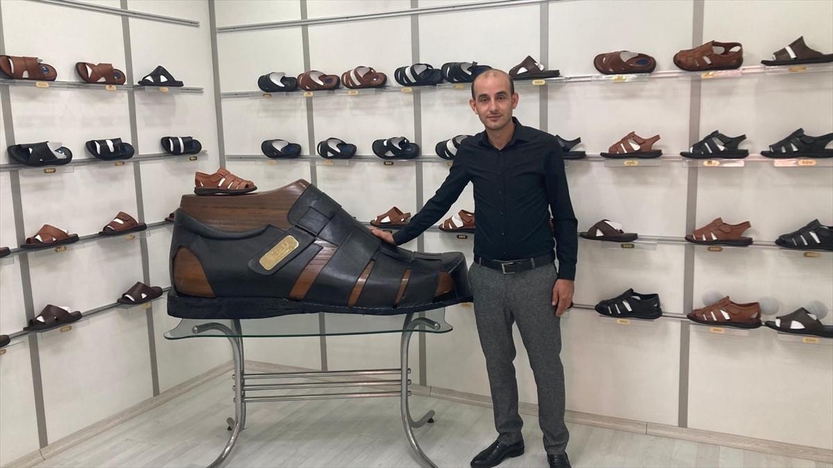 Konya'da ayakkabı imalatçısı Yasin Kulcu, 4 usta birlikte günde 7 saat çalışarak 30 günde fuarda sergilemek üzere 200 numara sandalet üretti.