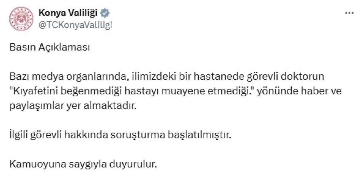 Konya Meram Devlet Hastanesi'nde yaşandığı iddia edilen olayda; görevli doktor kıyafetinin "açık" olduğunu öne sürdüğü genç bir kadını muayene etmeyi reddetti.