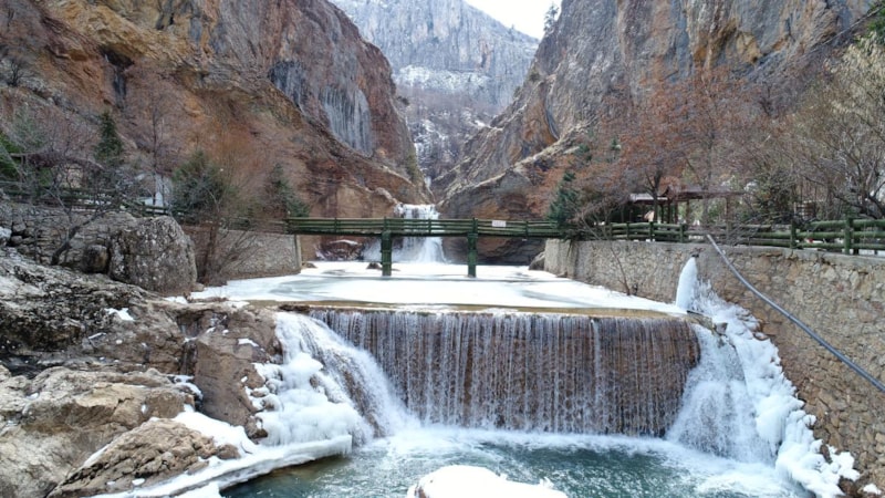 Konya'nın Taşkent ilçesi Çetmi Mahallesi Ayı Boğazı mevkiinde bulunan Çetmi Şelalesi, hava sıcaklığı eksi 18 dereceye kadar düşünce dondu.