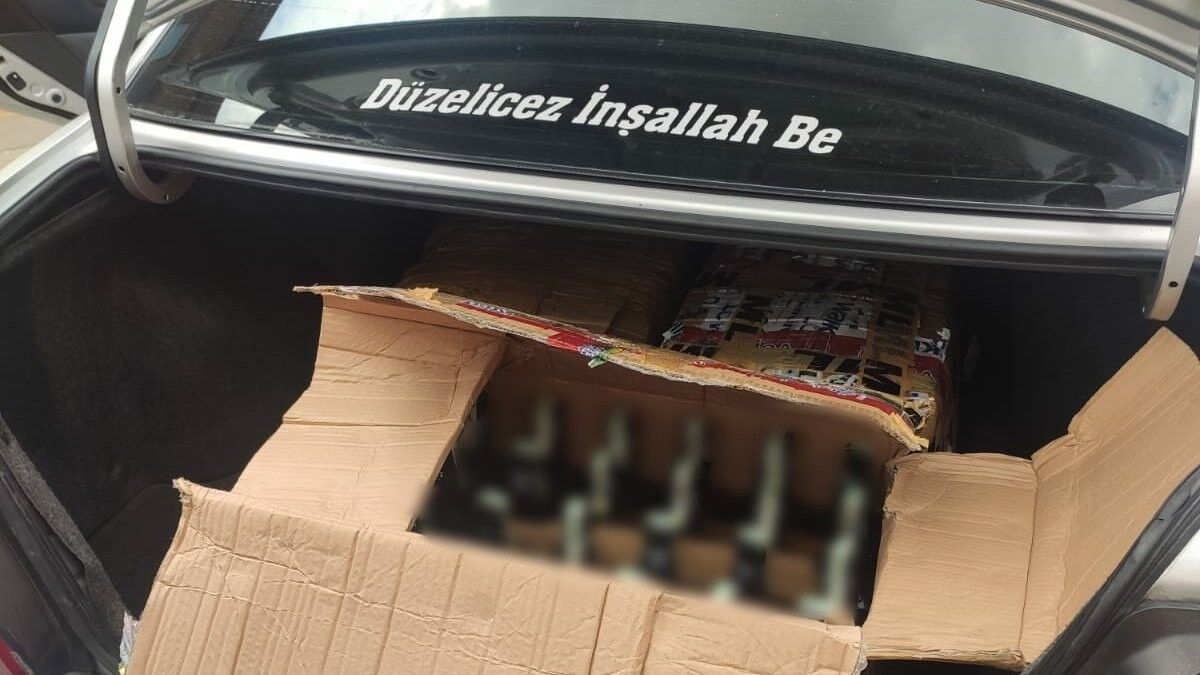 Yapılan aramalarda araçlarda koli içerisinde piyasaya sürülmek üzere hazır bulunan toplam 200 şişe farklı markalarda kaçak içki ele geçirildi. Arama yapılan araçların birinin arka camındaki "Düzelicez İnşallah be" yazısı dikkat çekti.