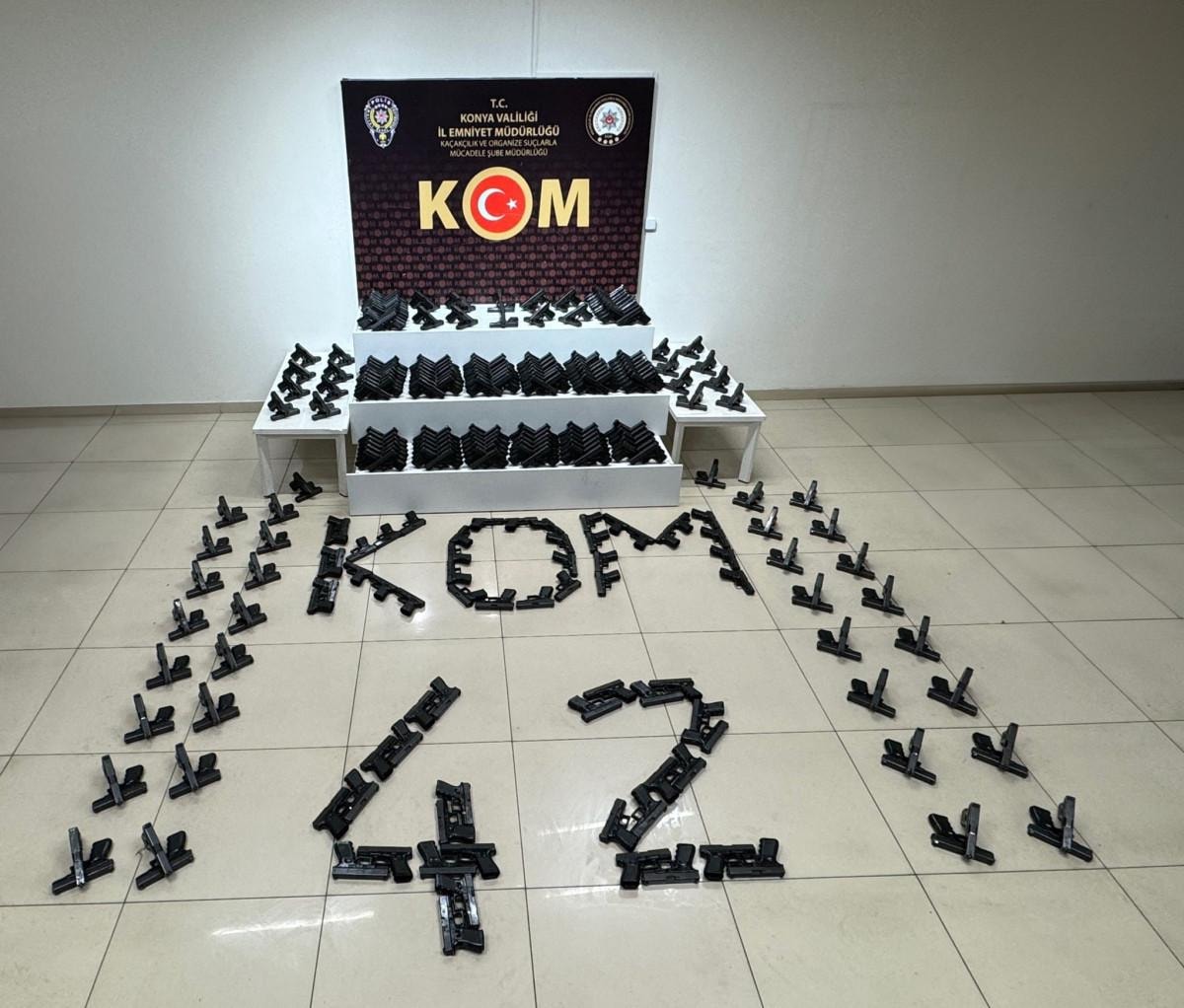 Konya Emniyet Müdürlüğüne bağlı Kaçakçılık ve Organize Suçlarla Mücadele Şube Müdürlüğü (KOM) ekipleri "6136 Yasak Olmayan Bıçak ve Diğer Aletleri Sırf Saldırıda Kullanmak Amacıyla Taşımak" suçuna yönelik yürütülen çalışmalar çerçevesinde Selçuklu ilçesinde bir ikamette kaçak silah stoklandığını belirledi.