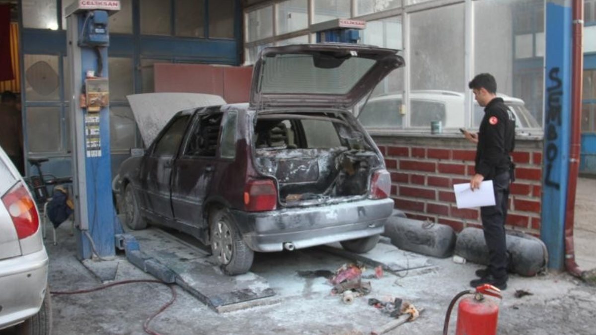 Otomobildeki LPG tankından sızdığı iddia edilen gazın, iş yerinde kıvılcım alarak patlama olmasının ardından tamir edilmekte olan otomobil de alev alarak yanmaya başladı.