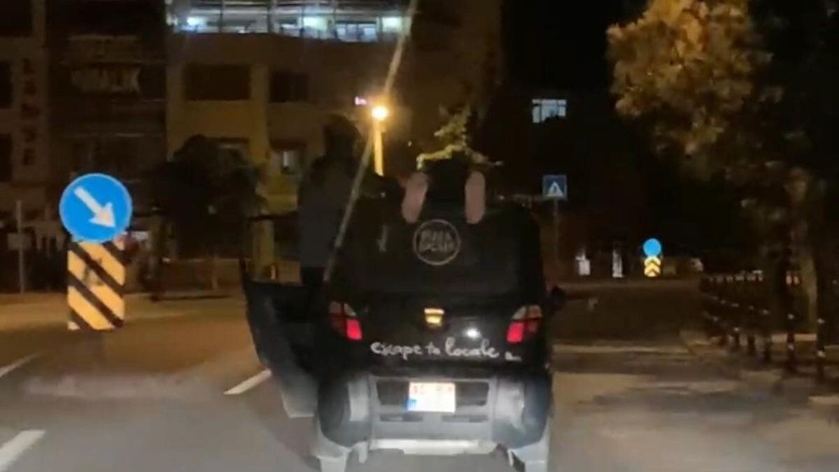 Konya’nın Meram ilçesi Aşkan Mahallesi Evliya Çelebi Caddesi üzerinde otomobilin üstüne yatan ve kapıları açık şekilde yolculuk yapan şahısların tehlikeli yolculuğunu görenler şaşkınlık yaşadı.