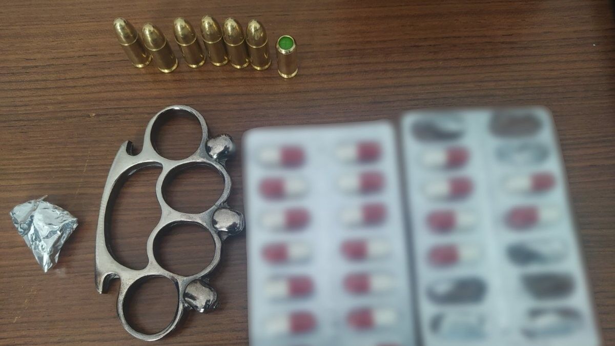 Şüpheli şahsın kaba üst araması sonucu; 20 adet uyuşturucu hap, bir miktar esrar, 7 adet tabanca fişeği ve bir adet muşta ele geçirdi.