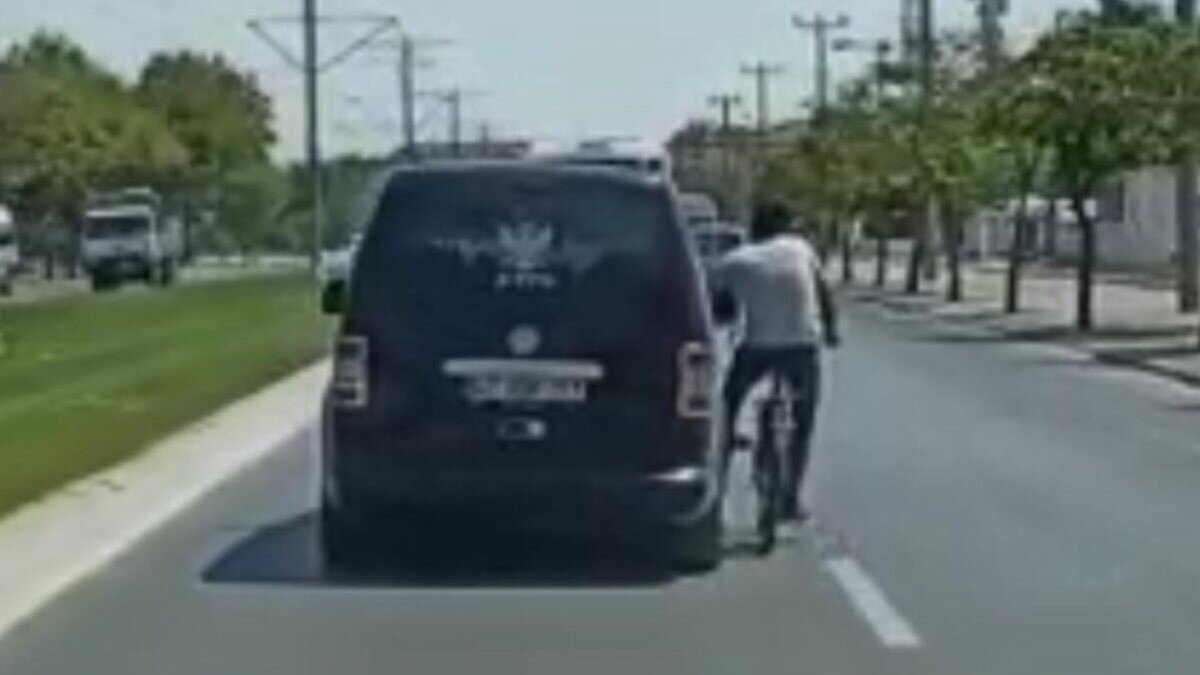 Rahat tavırlarıyla yolculuk yapan bisiklet sürücüsünün, tutunduğu aracın şoförüyle de sohbet etmesi dikkat çekti.