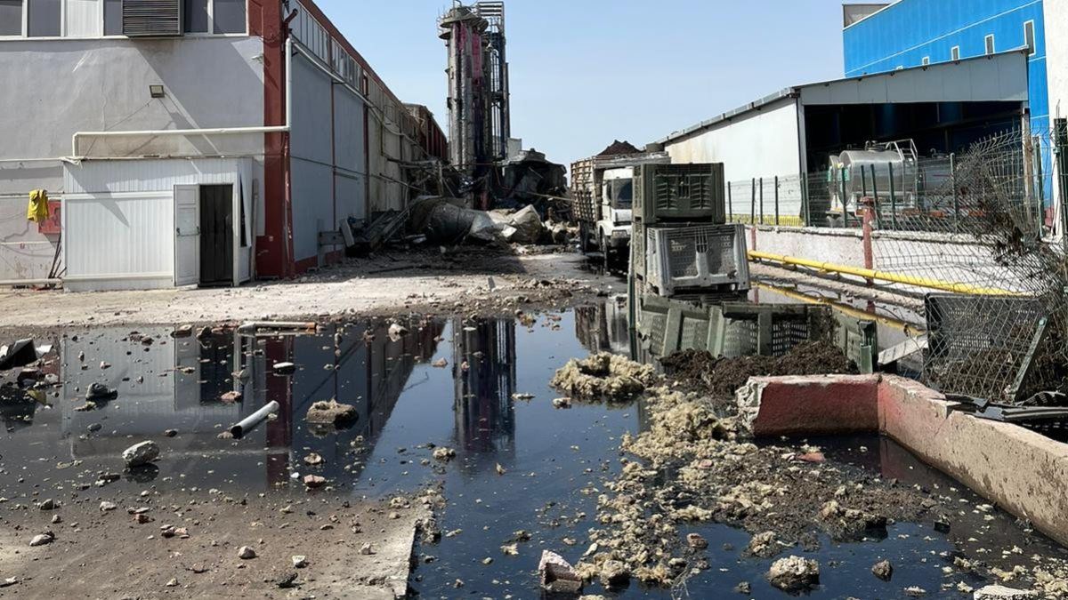 Patlama sonrasında fabrikadan dağılan parçalar, yan tarafta bulunan şalgam fabrikasının duvarına isabet etti.