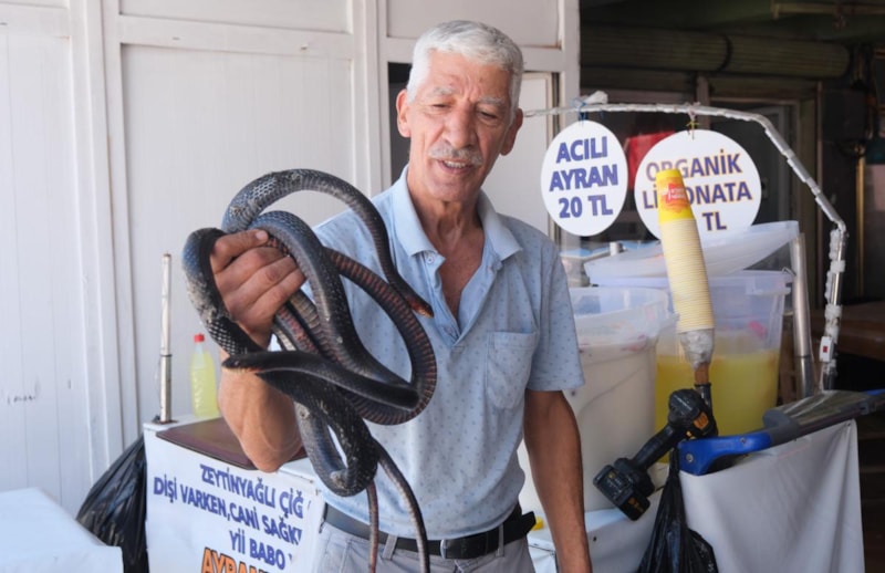 Adana Otogarı'nda uzun yıllardır çiğköfte satarak geçimini sağlayan Osman Aslan'ın (62) yılan sevgisi görenleri hayrete düşürüyor. Halk arasında 'zehirsiz kara yılan' olarak bilinen yılanları besleyen ve defalarca yılanlar tarafından ısırılan Aslan, halen yılanları bir an olsun bırakmıyor ve onları elleriyle süt içirerek besliyor. Ayrıca Osman Aslan, Adana Otogarı'nda yılanlarla şov yapıyor.