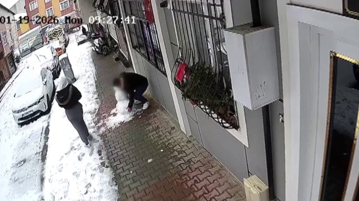 İstanbul'un Küçükçekmece ilçesine bağlı Söğütlüçeşme Mahallesi Korutürk Sokak’ta sokaktan geçen bir kişi, çevresini kontrol ettikten sonra çocukların yaptığı kardan adamı bulunduğu yerden alarak uzaklaştı.
