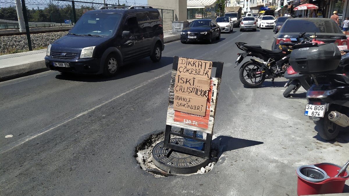 “Bir haftadır bu durumdayız. Ben burada esnafım, baklavacı dükkanım var. Burada ses oluyor, tabela koyduk ama o da kırıldı. Burada belediye otobüsü geliyor, zor geçiyor kaldırıma çıkıyor, ışıklarda zor durdu. Bir haftadır burayı bir türlü düzeltmediler. Büyükşehir’i aradık, İSKİ’yi aradık her yeri aradık, ilgilenen yok. Mahalle sakinleri binadaki kimse uyuyamıyor gece sesten. Biz bunu koymazsak, millet uyuyamıyor. Bunu koyduk, bu da kırıldı.”