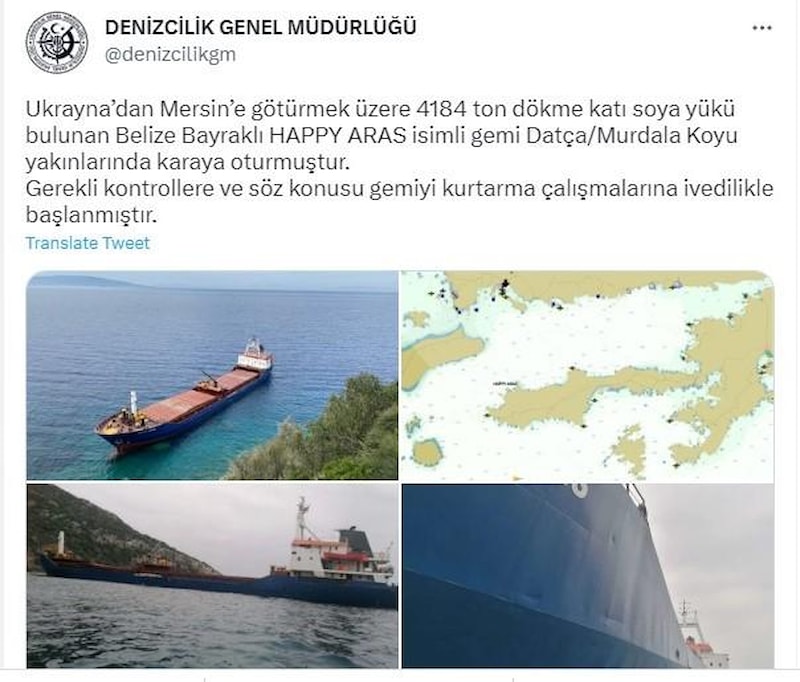 Denizcilik Genel Müdürlüğü’nden konuyla ilgili yapılan açıklamada ise “Ukrayna’dan Mersin’e götürmek üzere 4184 ton dökme katı soya yükü bulunan Belize Bayraklı Happy Aras isimli gemi Datça/Murdala Koyu yakınlarında karaya oturmuştur. Gerekli kontrollere ve söz konusu gemiyi kurtarma çalışmalarına ivedilikle başlanmıştır.” denildi.