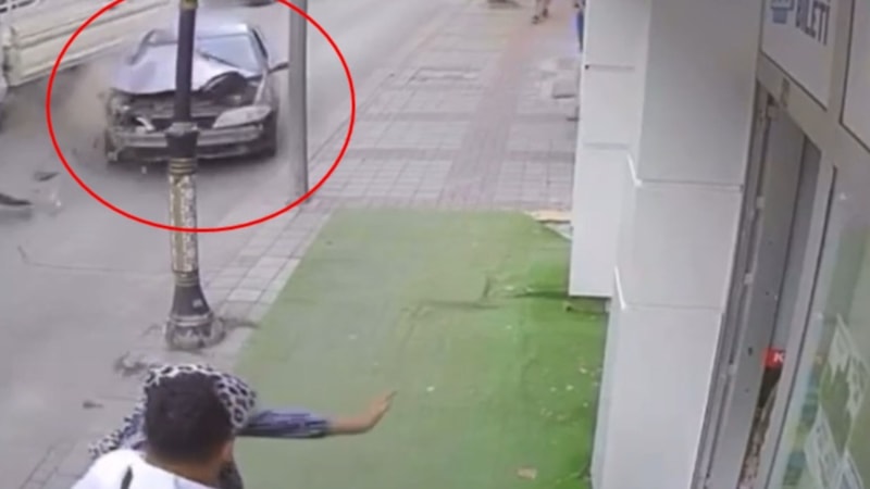 Kentte ehliyetsiz ve alkollü sürücünün kullandığı otomobil, park halindeki kamyonet ile kaldırımdaki aydınlatma direğine çarparken güvenlik kamerası görüntülerinde kaldırımdaki yayaların aracın altında kalmaktan saniyelerle kurtulduğu görüldü.