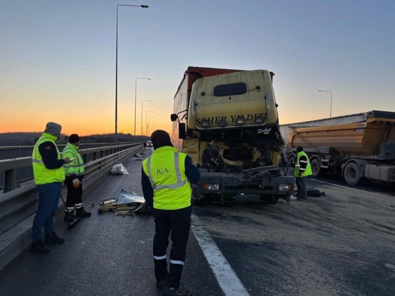 Kuzey Marmara Otoyolu Riva sapağı Edirne istikametinde kamyon, seyir halindeyken aynı yönde seyreden tıra arkadan çarptı.
