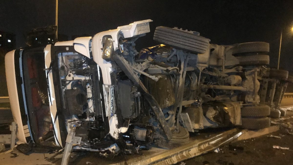 Kontrolden çıkan tır, yol kenarındaki bariyerlere çarptıktan sonra devrilerek yan yattı. Kaza sonrası tır sürücüsü İbrahim Y., kendi imkanları ile tırdan çıktı.