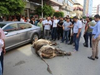 İlçe merkezinde araç trafiğini aksatan angus, zabıta ekiplerince bir süre kovalandıktan sonra uyuşturucu iğneyle vurularak yakalandı.