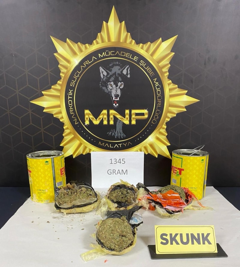 Malatya'da trenle yolculuk yapan bir kadının valizinde yapılan aramada margarin kutuları içerisine gizlenmiş 1 kilo 345 gram skunk maddesi ele geçirildi.