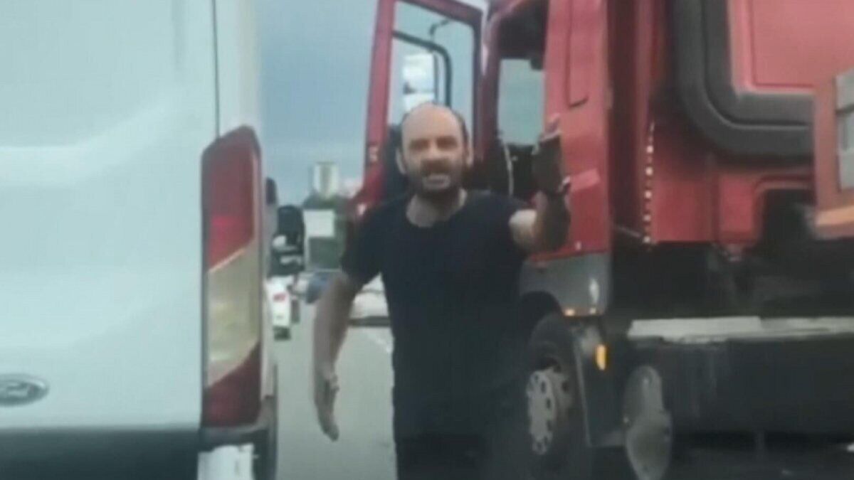 Uyarı üzerine trafikte tartışma başladı. Tır şoförü, otomobilin önünü keserek küfür ve hakaretler etmeye başladı.