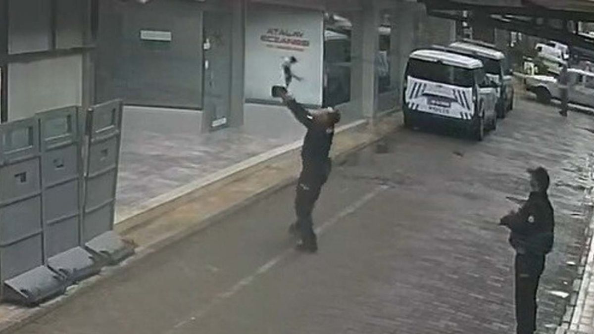 Bu sırada kedi dengesini kaybederek aşağı düştü. Polis memurlarından biri, düşen kediyi kurtarmak amacıyla şapkasını çıkarıp uzattı. Kedi, şapkaya çarpıp yere düşerken hızı azaldı ve kısa süre sonra olay yerinden uzaklaştı.