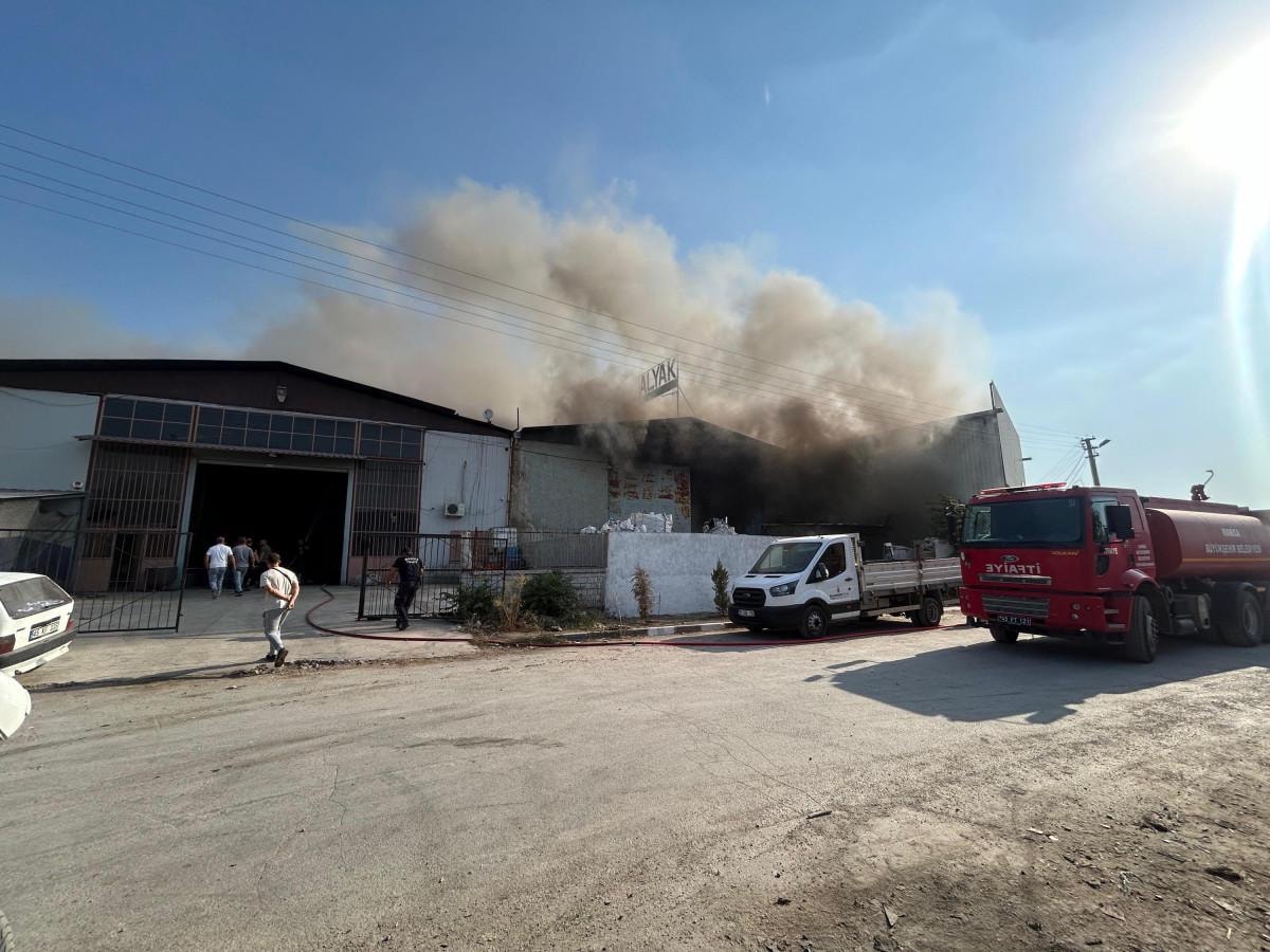 Manisa'nın Turgutlu ilçesinde, Atatürk Mahallesi'nde bulunan Koşukırı Çarşısı'nda geri dönüşüm malzemelerinin bulunduğu bir iş yerinde, saat 17.00 sıralarında henüz bilinmeyen nedenle yangın çıktı.