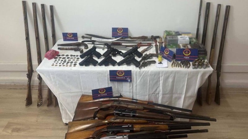 Jandarma ekiplerinin bir ikamete düzenlediği operasyonda ruhsatsız silahlar, mühimmat ve tarihi eser niteliği taşıyan objeler ele geçirildi.