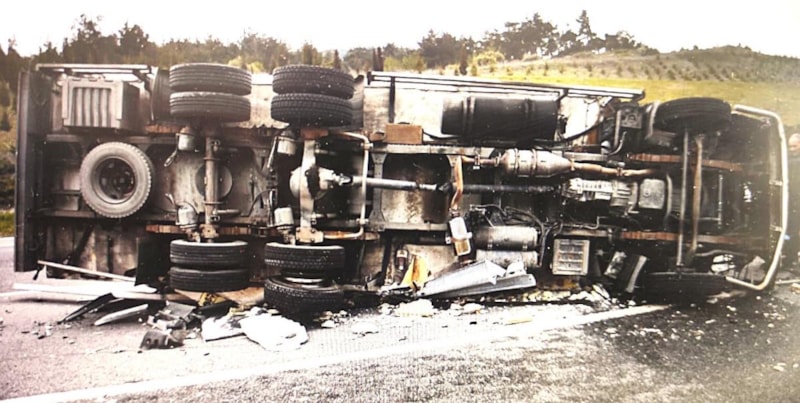 Özcan Türker yönetimindeki et yüklü tır, sürücüsünün direksiyon hakimiyetini kaybetmesi sonucu refüje çarparak devrildi.