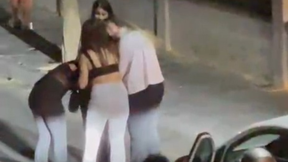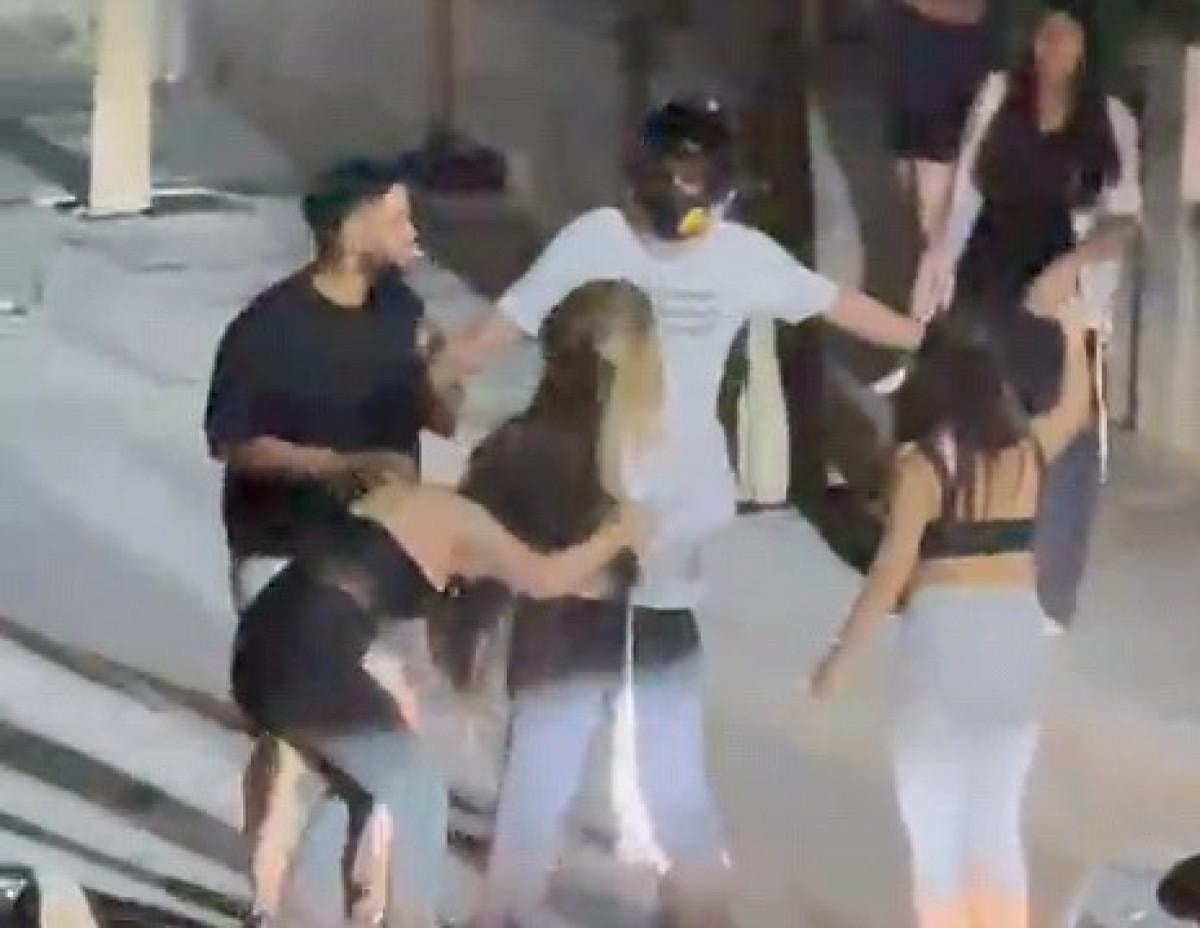 İki genç kız sokak ortasında saç saça girerken, çevredeki birkaç kişi araya girmeye çalıştı ancak başarılı olamadı.