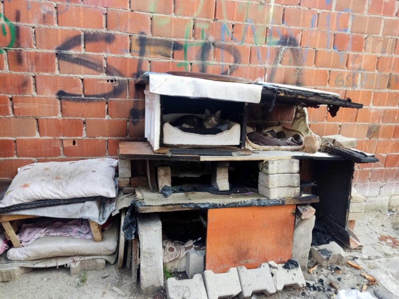 Mahalleli tarafından sokak kedileri için yapılan kulübeler, kimliği belirsiz kişi tarafından ateşe verildi. O anlar, bir apartmanın güvenlik kamerasına yansıdı.