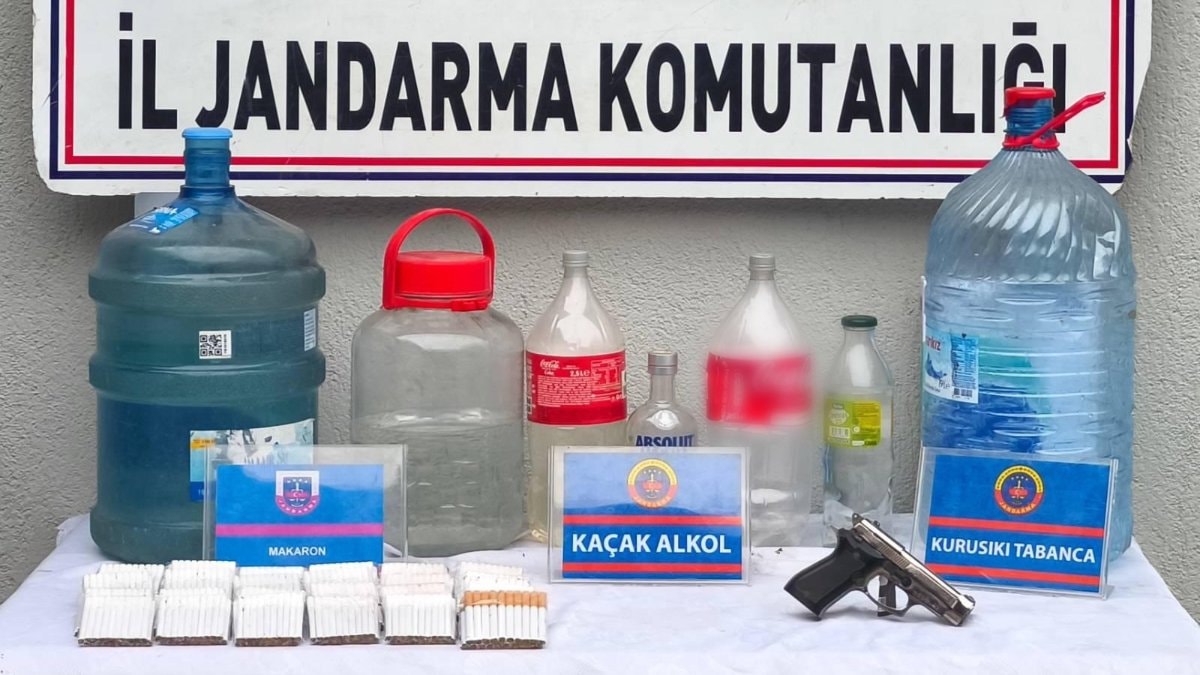 - 25 litre sahte rakı, 620 adet makaron ve bir kurusıkı tabanca ele geçirildi.