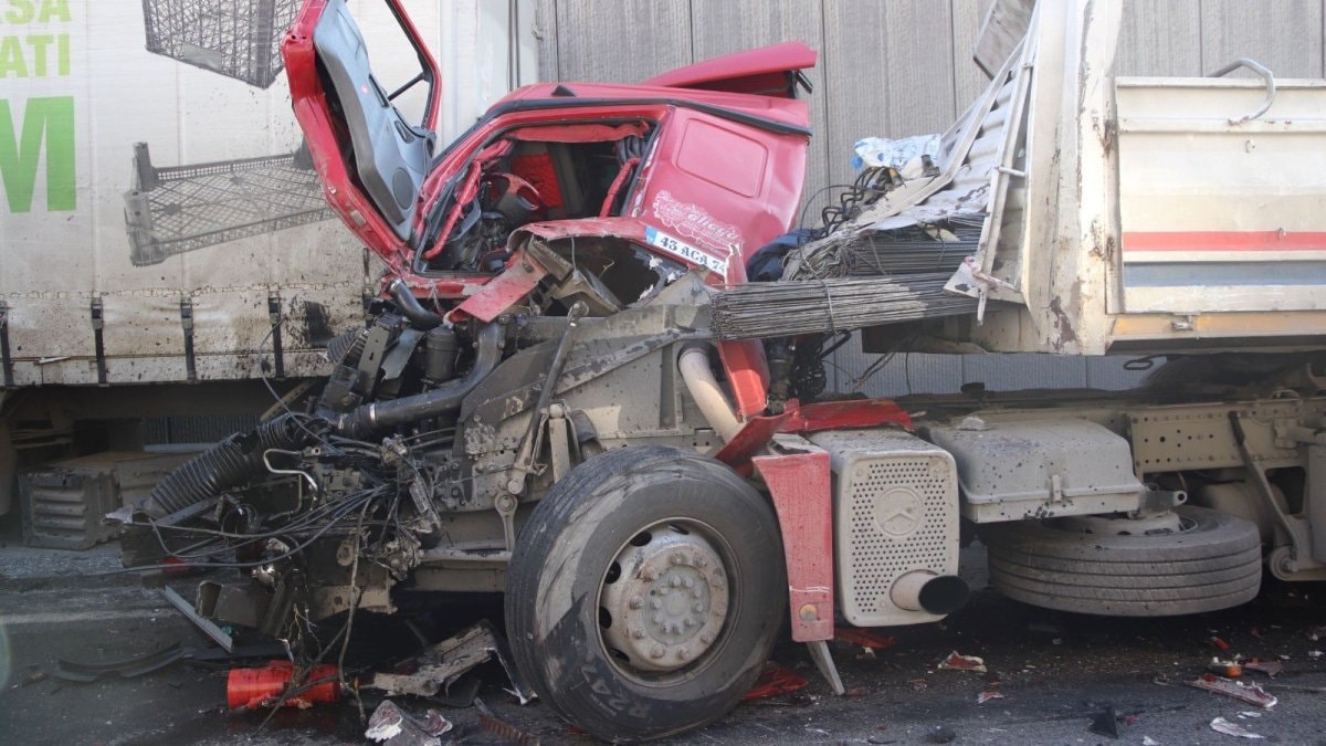 Manisa'nın Turgutlu ilçesi Alpaslan Türkeş Köprülü Kavşağı alt geçitte aynı yönde seyir halindeki tırlar alt geçitte çarpıştı.